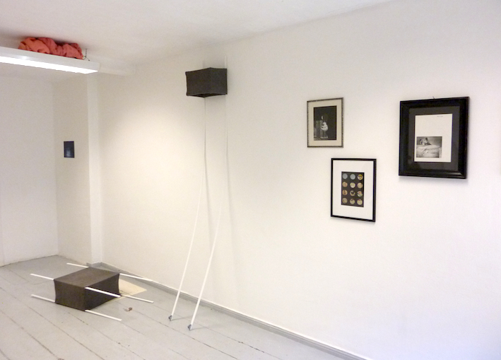 h - large view (left to right) - 2011, Michael Barthel, NEST, wood, paint, fabrik, wheels, hinge // Barbara Breitenfellner - 2006 / 2008, Ohne Titel, collages and